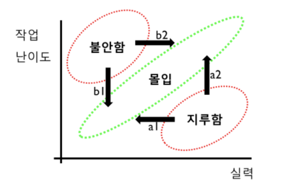 애자일 방법론의 김창준님은 실력을 성장시키기 위한 방법으로, 양적으로 1만 시간을 채운다는 한다는 조건 하에, 질적으로 어떤 조건을 갖춰 의도적 수련을 해야만 가능하다고 말한다. 어떤 조건 하에 의도적 수련을 거듭하면 실력을 늘릴 수 있다는 것이다. 그 조건은 '적절한 난이도'이다. 나의 실력보다 쉬운 일(a)을 하는 경우 지루함을 느끼게 되고, 어려운 일(b)을 하게 되면 불안감이나 두려움을 얻게 된다. 아래 그림에서 빨간 동그라미 부분이다. 난이도와 실력이 비슷한 경우(c) 우리는 '몰입'을 경험할 수 있고 "최고 수준의 행복감과 최고 수준의 집중력을 보이고, 그 덕분에 퍼포먼스나 학습 능력이 최대치를 보일 수 있다"고 한다.